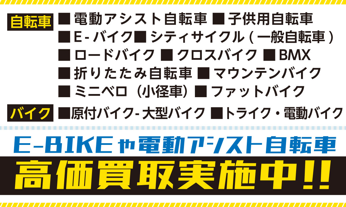 その他にもたくさんお問合せ頂いております! 大事に乗っていた自転車やバイクだから、高く買い取って欲しい バッテリー不良の電動アシスト自転車があるけど、査定価格はつくのでしょうか? 海外メーカーのE-BIKEがあるけど買い取ってもらえますか? しばらく乗っていない自転車やバイクがあるが、買取の価格が気になる 不動車・事故車だけど、引き取ってもらえるか心配 価格がつくのか廃車にしないといけないのか自分では判断ができない
